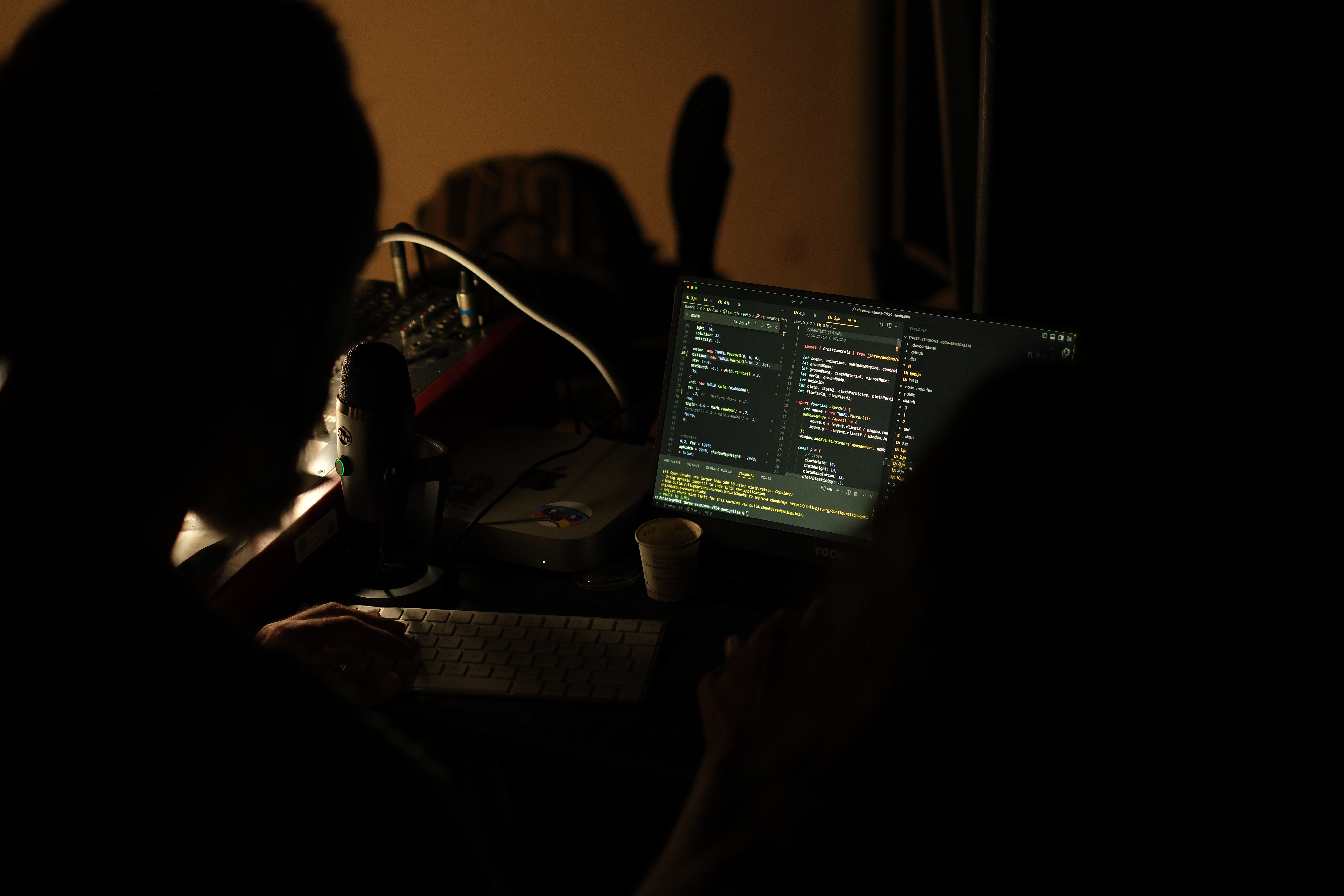 The Digital Experience Lab, directed by Daniele Tabellini, conceived, designed, and developed software for the creation of live visuals to accompany the text and acting. Divided into groups, each team worked independently but complementarily, using approaches and techniques for concept design, expressive programming, and creative coding. The group I worked with focused on the scenography of three scenes for which we created a cloth that takes on different shapes and meanings throughout the show, using three.js and cannon.js (︎ more info).